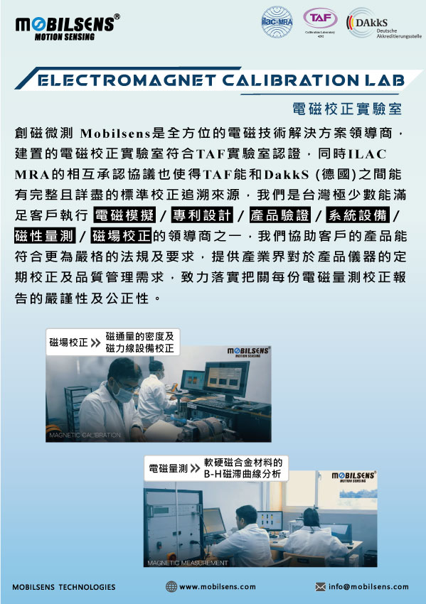 創磁微測 Mobilsens是全方位的電磁技術解決方案領導商,建置的電磁校正實驗室符合TAF實驗室認證,同時ILAC MRA的相互承認協議也使得TAF能和DakkS(德國)之間能有完整且詳盡的標準追溯來源,是全台灣極少數能滿足客戶執行 電磁模擬/專利設計/產品驗證/系統設備/磁性量測/磁場校正 的領導商之一,我們協助客戶的產品能符合更為嚴格的法規及要求,提供產業界對於產品儀器的定期校正及品質管理需求,致力落實把關每份電磁校正報告的嚴謹性及公正性。