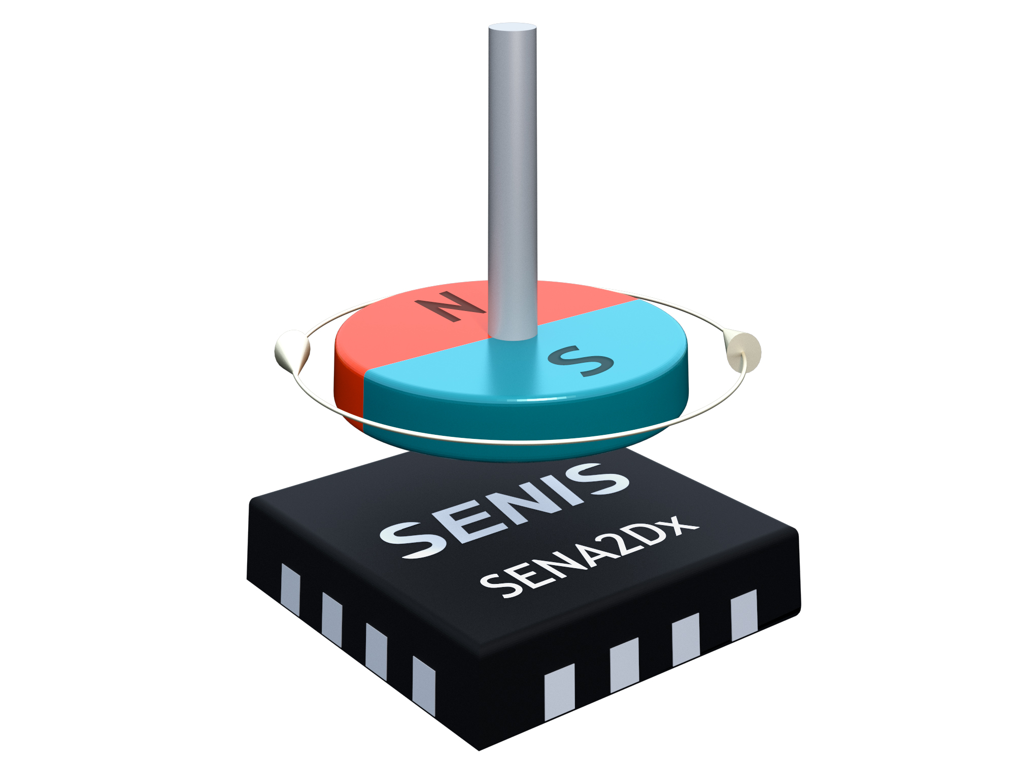 SENIS® 快速磁性角度傳感器 (FAMAS) SENA2Dx 是一種多功能磁場感測器,可以測量磁場的平面內分量的旋轉角,例如馬達軸心上旋轉軸的磁鐵。