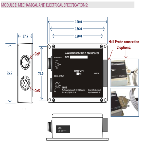模組E提供了用於霍爾探棒和額外的調節霍爾探棒的輸出信號:訊號放大,高度線性化,抵消偏移,溫度變化補償和頻寬限制。