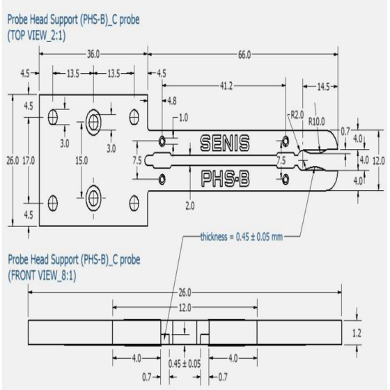 PHS-B 探棒支架可用於將 SENIS 霍爾探棒穩定固定於氣隙中進行量測,保護探棒避免操受機械損壞。固定探棒治具由環氧樹脂層壓板 FR4 製成, 是一種具有良好尺寸穩定性和機械堅固性的材料。 治具的橫截面積為 2mm x12mm。